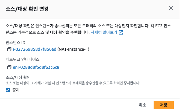 NAT 인스턴스는 소스 또는 대상이 그 자체가 아닐 때에도 트래픽을 송수신할 수 있어야 하기 때문에 소스/대상 확인을 중지한다.