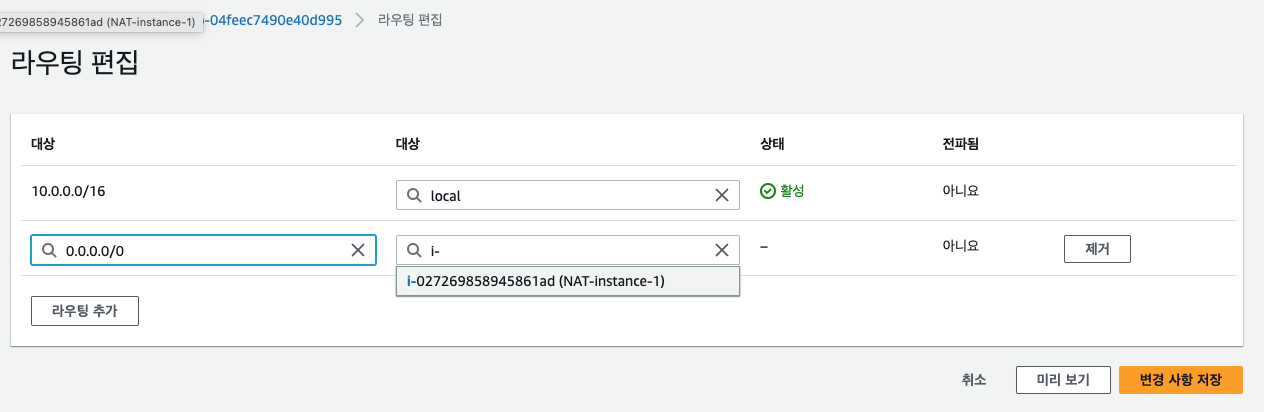private 서브넷에서 발생되는 모든 트랙픽(0.0.0.0/0)에 대해 NAT 인스턴스를 향하도록 합니다.
